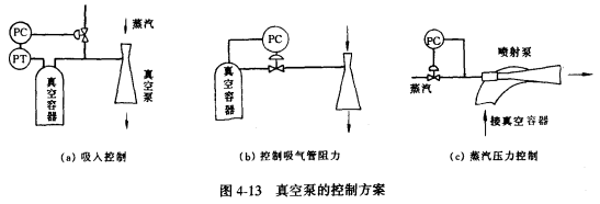 (3)對蒸汽噴射式真空泵,在泵的一定設(shè)計條件下,只要保證一定的蒸汽壓力,就能達(dá)到一定的真空度。因而一些企業(yè)只使用一個蒸汽壓力控制系統(tǒng),如圖4—13(c),就可以取得滿意的效果。
